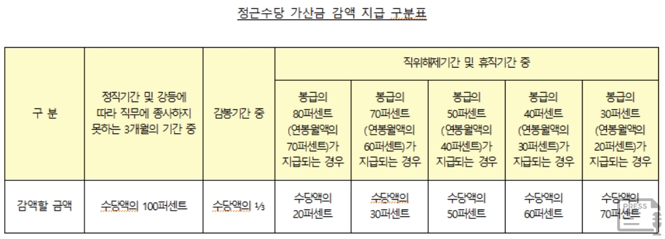 정직, 감봉 및 휴직으로 봉급이 지급되지 않거나 감액 지급되는 사람에게는 감액을 하여 지급을 합니다. 정직기간 및 강등에 따라 직무에 종사하지 못하는 3개월 기간은 100% 감액을 합니다. 지급하지 않습니다. 감봉기간 중에는 정근수당 가산금의 1/3을 감액합니다.