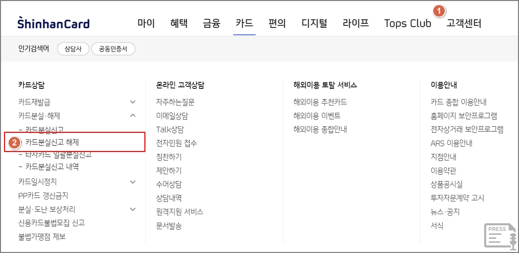 ① 홈페이지 고객센터 > 카드분실신고 해제
