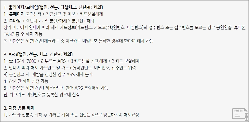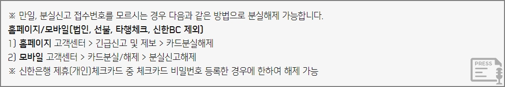 ①분실신고 접수번호를 모르거나, ②법인, 체크, 신한BC, 선불카드인 경우, 그리고 ③분실신고 후 재발급 신청되어 카드발급 확정된 경우에는 분실신고 해제가 되지 않습니다. 특히, 재발급 신청을 한 경우에는 재발급된 카드를 사용해야 합니다. 분실신고 접수 시 재발급 신청된 경우 카드발급이 확정되지 않았더라도 홈페이지/모바일/ARS를 통한 해제가 불가하며 지점 방문 해제만 가능합니다.