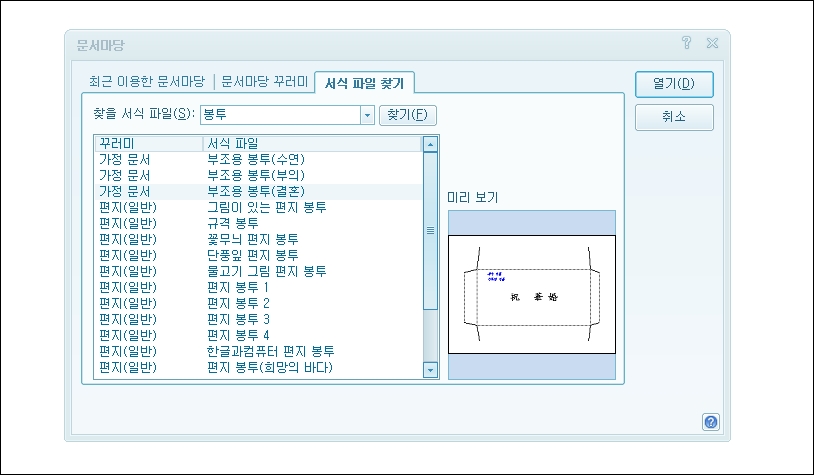 한글 프로그램에서 결혼식 봉투 양식을 만들 수 있습니다. 이대로 사용을 하면 불편한 부분이 있어 그대로 사용을 하지는 않고 수정을 해서 사용하고 있습니다. 수정된 파일은 아래에서 다운로드 가능합니다. 먼저 만드는 방법부터 알아보도록 하겠습니다.
