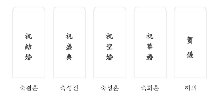 일반적으로 결혼식 때에는 5가지를 많이 씁니다. 축결혼, 축화혼, 축성전, 축성혼, 하의입니다. 이 중에서 최근에는 '축결혼' 이라는 말을 가장 많이 사용을 하고 있습니다. '축결혼'은 신랑에게 축하를 할때, '축화혼'은 신부에게 축하를 할 때 사용을 했었습니다. 하지만 최근에는 남녀 구분 없이 '축결혼'을 축하 문구로 많이 사용을 하고 있습니다. ▼ 부의금 봉투 쓰는 법 , 장례식 봉투 서식 다운로드 받기