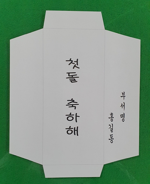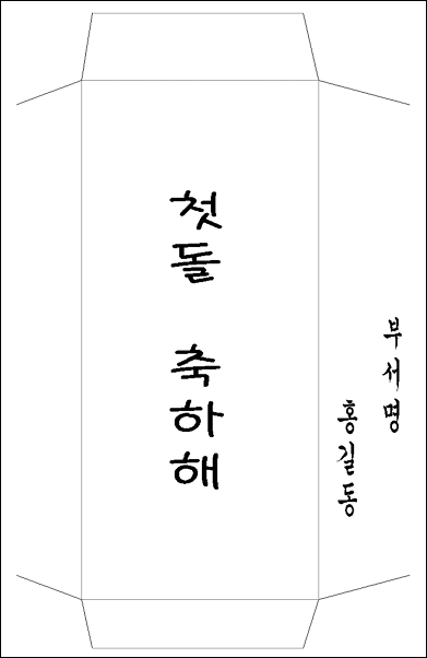 예쁘고 귀여운 돌잔치 봉투는 많이 있습니다. 이 양식은 가장 간단한 양식입니다. 앞면에는 '첫돌 축하해' 라는 문구와 뒷면에는 부서명 등 소속과 이름을 적을 수 있습니다. 원하는 폰트와 글씨 크기를 변경해서 사용을 해도 됩니다. 나만의 문구로 변경을 해서 사용해도 됩니다.