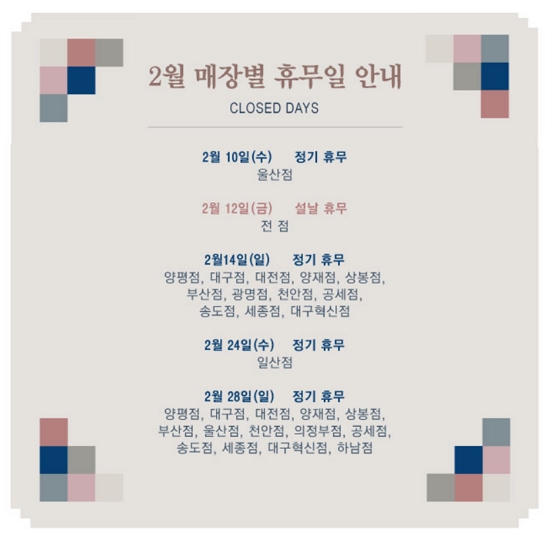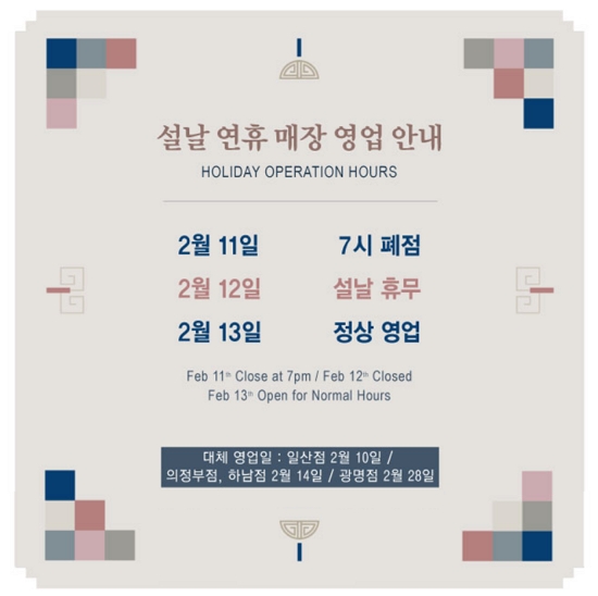 2월에는 대체 영업일이 있습니다. 일산점의 2월 10일 , 의정부점과 하남점은 2월 14일, 광명점은 2월 28일 입니다. 이날은 쉬어야 하는날이나 대체 영업으로 인하여 정상 운영을 합니다.