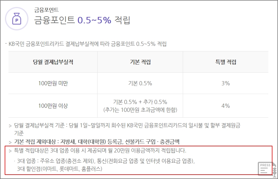 특별대상은 주유소, 통신, 이마트, 롯데마트, 홈플러스입니다. 여기에서 사용한 금액은 당월 실적에 따라 특별적립 3~4%가 추가가 됩니다. 특별대상에서 사용한다면 메리트가 있습니다.