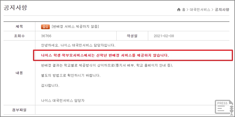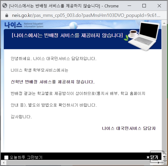 "나이스에서는 반배정 서비스를 제공하지 않습니다."
