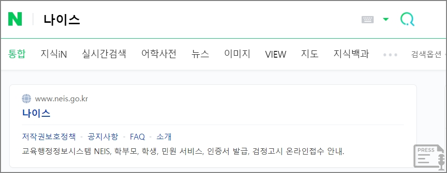 검색 창에서 '나이스'로 검색을 합니다. 나이스에서는 검정고시 온라인 접수도 가능하네요. 예전에는 영문 그대로 발음을 해서 '네이스' 라고 했습니다. 최근에는 '나이스'로 부르고 있습니다. <▼나이스 바로가기>