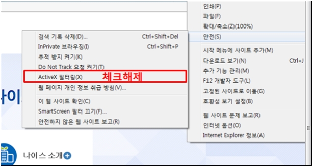 1. 도구 > 안전 > ActiveX필터링 체크 해제를 클릭합니다.