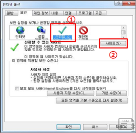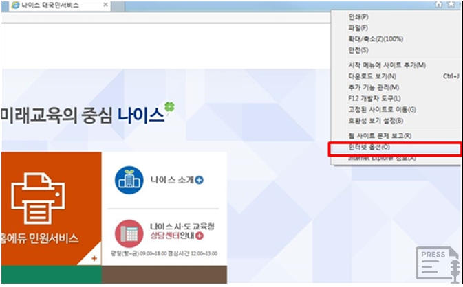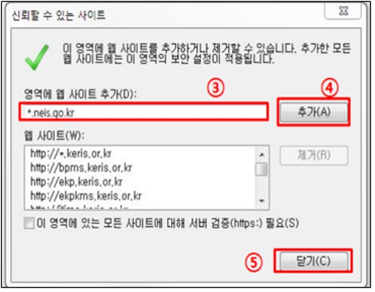 1. 도구 > 인터넷옵션 > 보안 탭 > 신뢰할 수 있는 사이트에 *. neis.go.kr 및 사용하시려는 시·도교육청 주소 입력 후 추가를 합니다.