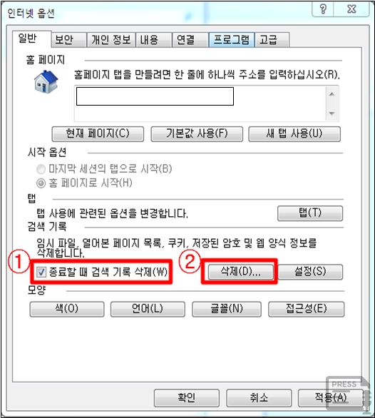 2. 인터넷옵션 > 일반 탭에서 '종료할 때 검색기록 삭제'에 체크를 합니다. 삭제를 클릭합니다.