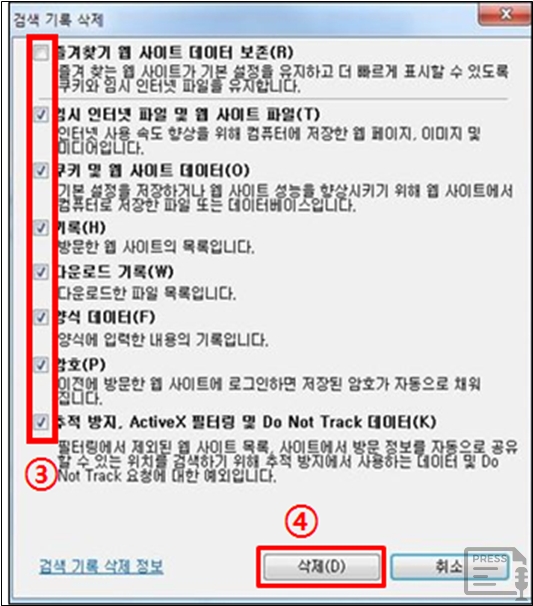 3. 임시 인터넷 파일 및 웹사이트 파일, 쿠키 및 웹사이트 데이터, 기록, 다운로드 기록, 양식 테이터, 암호, 추적 방지 등을 체크 후 삭제를 클릭합니다.