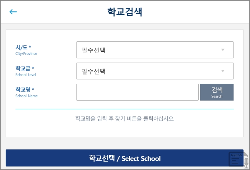학교는 학교검색을 통해 입력이 가능합니다. 시도, 학교급, 학교명을 입력을 검색을 하여 본인의 학교를 선택을 합니다.