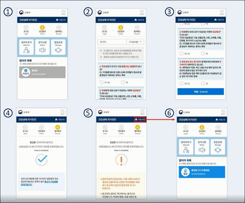 언어를 선택 후 설문지를 읽고 건강상태를 체크하면 됩니다. 정확하게 입력하는 것이 매우 중요합니다. 발열 또는 발열감, 임상증상, 자가격리 여부 등에 답을 하고 제출을 합니다. 그러면 등교 가능여부 결과를 확인할 수 있습니다.