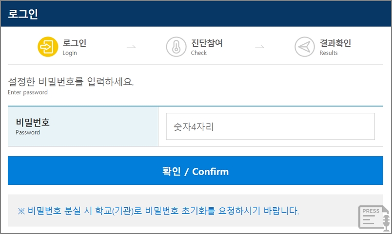 설정한 비밀번호 숫자 4자리를 입력하세요. 비밀번호를 까먹을 경우에는 학교로 비밀번호 초기화를 요청해야 합니다.