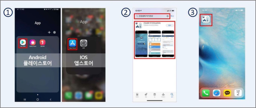 모바일 앱으로도 건강상태 자가진단이 가능합니다. 진행방법 및 설문 내용은 PC와 동일합니다. 플레이스토어, 앱 스토어에서 '건강상태 자가진단(교육청)' 앱을 다운로드 받아 설치 후 제출하면 됩니다.