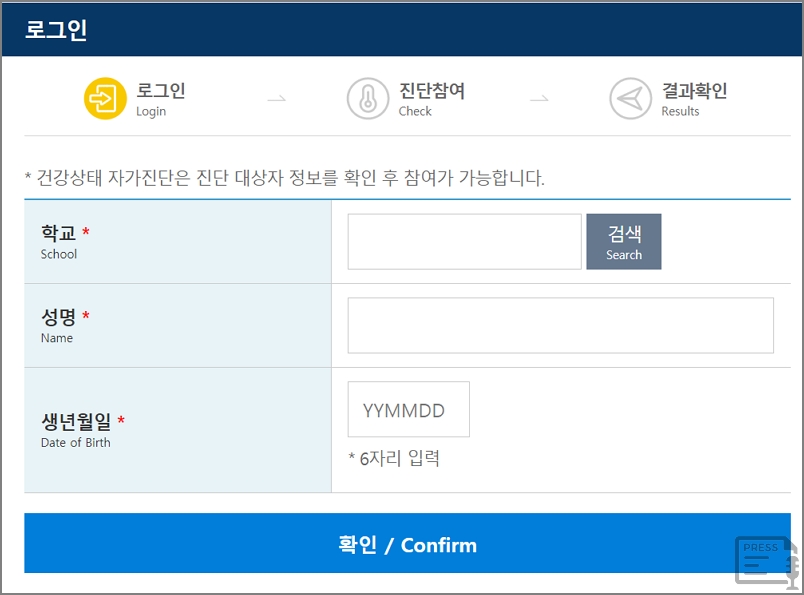 건강상태 자기진단을 하기 위해 로그인을 합니다. 학교, 성명, 생년월일 6자리를 입력을 합니다.