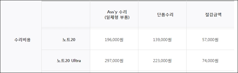노트20의 경우 수리후 액정을 반납하느냐, 반납하지 않느냐에 따라 수리비용이 다릅니다. 그리고 액정을 통째로 교체하지 않고 단품으로 수리하는 경우는 조금 더 비용이 절감이 됩니다. 단품수리는 액정부분 케이스는 재사용하고 순수한 액정단품만 수리하는 것을 말합니다.