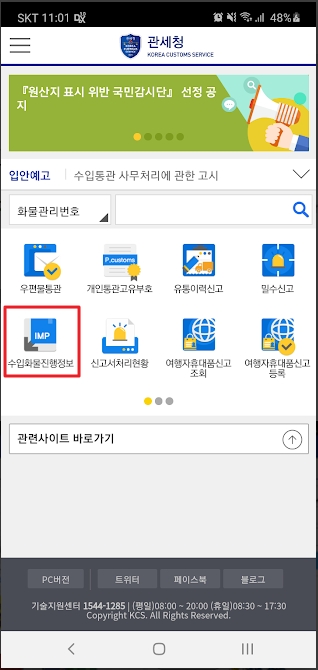 1. 모바일 관세청 앱(App) 실행 후 첫 화면에서 '수입화물진행정보'를 클릭합니다.
