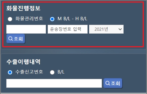 4. 화물관리번호 15자리 또는 19자리를 입력하여 조회를 합니다. 'M B/L - H B/L'는 Master 화물인 경우 첫 번째 칸에 입력하여 조회하고, House 화물인 경우 두 번째 칸에 입력하여 조회를 합니다.