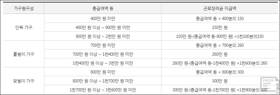 맞벌이가구의 경우는 총급여액이 800만원 미만이면 총급여액의 300/800을 곱한 금액을 지급받게 됩니다.