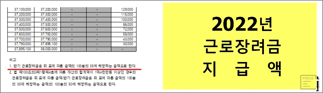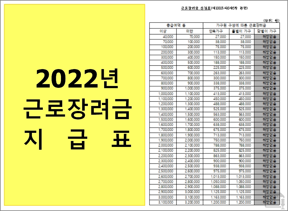 위 산식은 계산편의를 위한 것이입니다. 정확한 금액은 아래의 2022년 근로장려금 산정표에 따라 지급을 합니다.