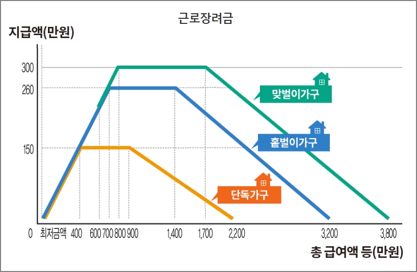 소득이 많지 않아 생활이 어려운 근로자, 사업자, 종교인 가구에 대해서 가구원 구성과 총급여액에 따라 산정된 근로장려금을 지급하고 있습니다.