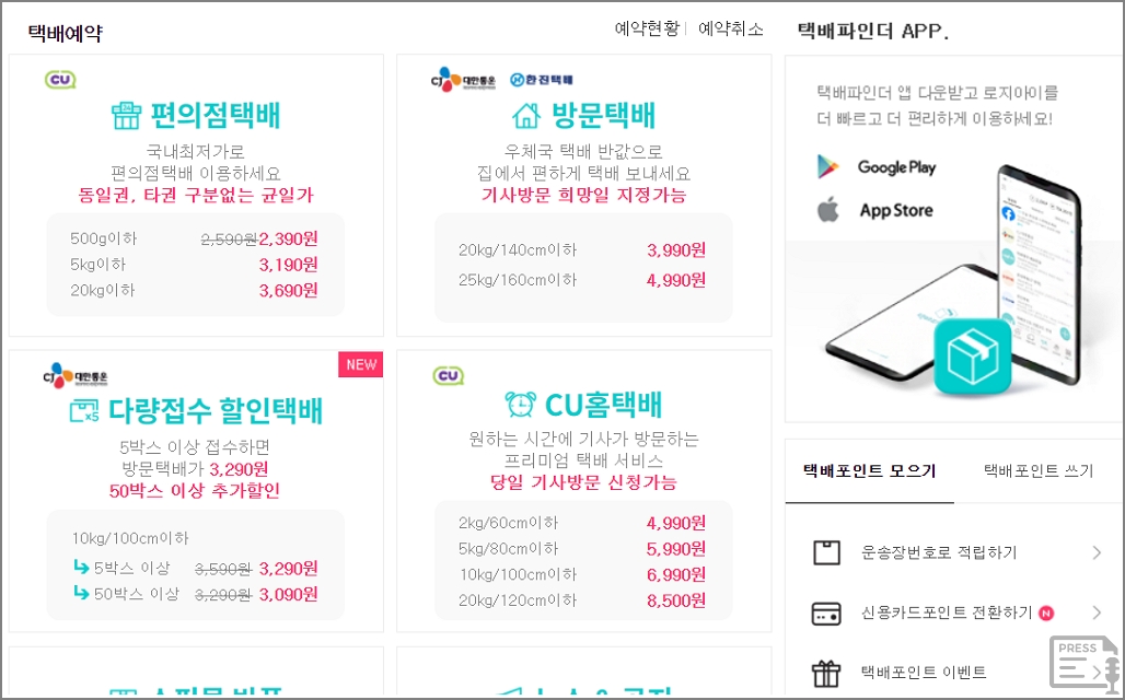 신한카드의 디지털 플랫폼인 신한페이판을 이용하는 경우 cu 편의점 택배 이용 시 2,390원입니다. 신한페이판 로그인 후 검색창에 택배를 검색하면 택배 예약/ 조회 메뉴가 나옵니다. cu편의점을 선택하면 됩니다.