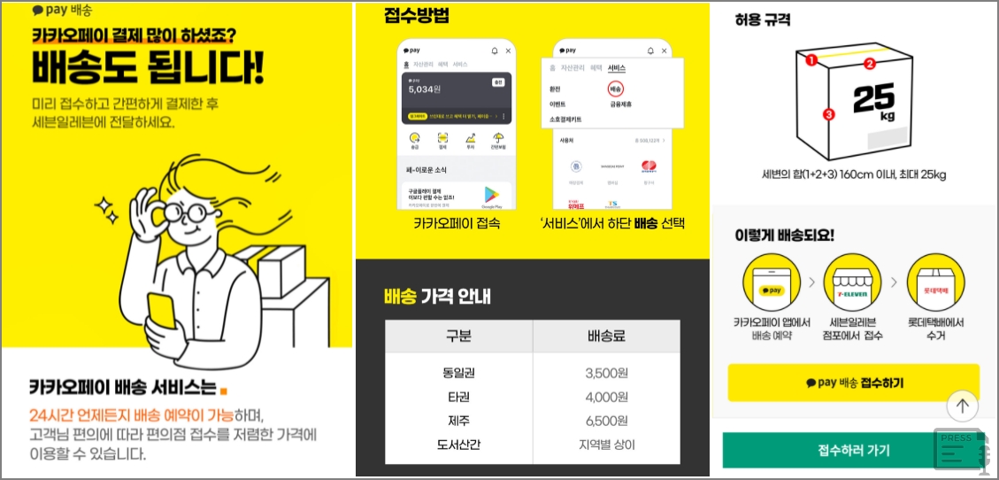 카카오페이 앱에서 배송예약을 하고 세븐일레븐에서 접수를 하면 됩니다. 가격은 3,500원입니다.