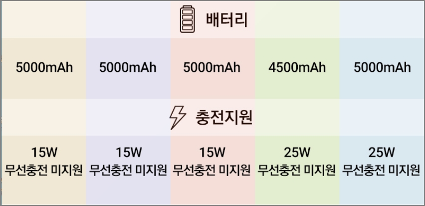 배터리 용량을 비슷합니다. A12, A32, A42, A72는 5000mAh입니다. A52는 조금 작은 4500mAh입니다. 보급형이다보니 모두 무선충전은 지원하지 않습니다. 충전속도도 확인을 해보세요.