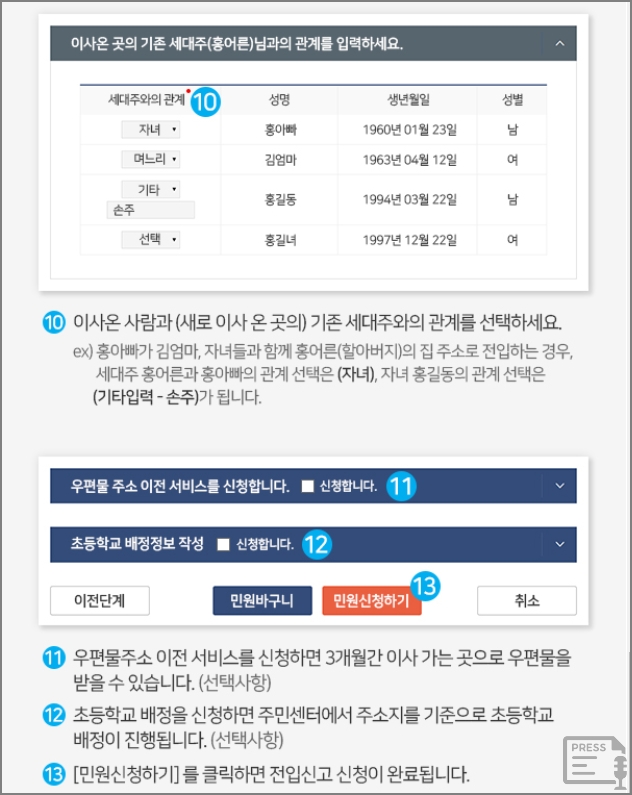 이사온 사람과 새로 이사 온곳의 기존 세대주와의 관계를 입력합니다. 우편물 이전 서비스를 신청하면 3개월간 이사 가는 곳으로 우편물을 받을 수 있습니다. 초등학교 배정 신청을 하면 주민센터에서 주소지를 기준으로 초등학교 배정이 됩니다. 다 입력 후 민원신청하기를 클릭하면 온라인 전입신고 신청이 완료 됩니다.