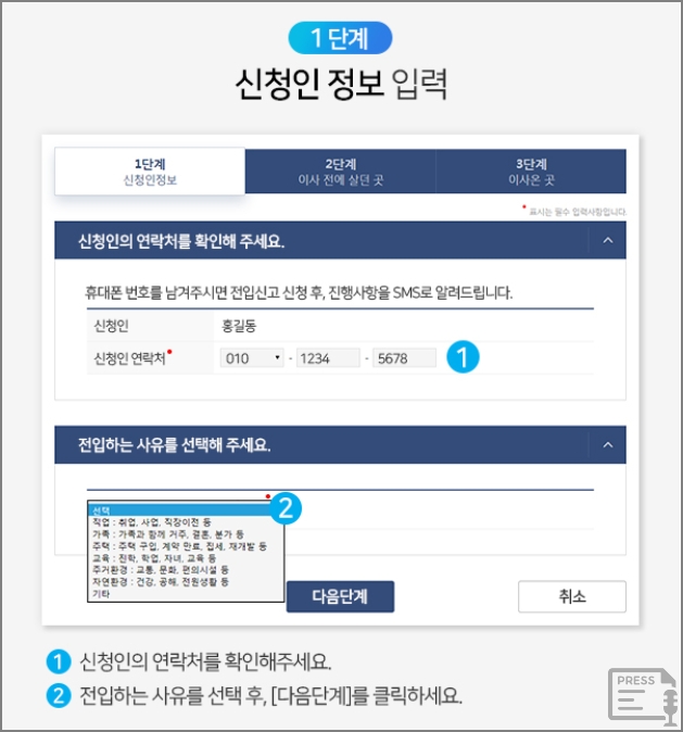 1. 1단계로 신청인 정보를 입력합니다. 신청인 연락처와 전입하는 사유를 선택하면 됩니다. 전입 사유에는 취업, 결혼, 주택구입, 전세, 월세, 교육 등이 있습니다. 본인에게 맞는 전입사유로 선택을 하세요.