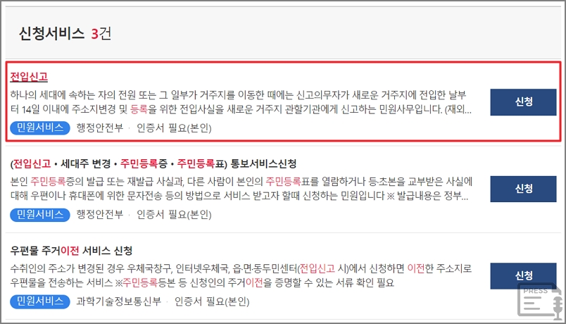 2. 전입신고 신청 서비스가 나옵니다. 신청 버튼을 클릭합니다. 전입신고는 새로운 곳에 전입한 날부터 14일 이내에 하여야 합니다. 늦지 않게 신청을 하면 됩니다.