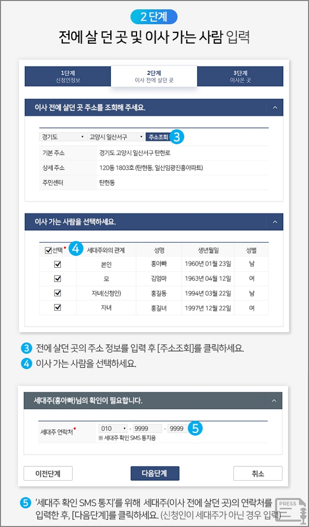 2. 2단계는 전에 살 던 곳 및 이사가는 사람 정보를 입력합니다. 전에 살던 곳의 정보를 입력합니다. 그리고 이사가는 사람을 선택하면 됩니다. 세대주 SMS 확인 통지를 위해 세대주의 연락처를 입력합니다.