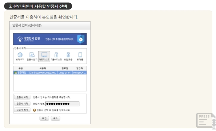 2. 본인 확인에 사용할 인증서를 선택합니다. 인증서를 이용하여 본인임을 확인을 합니다.