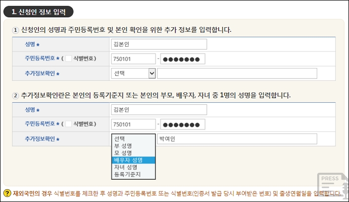 1. 신청인 정보를 입력합니다. 신청인의 성명과 주민등록번호 및 본인 확인을 위한 추가 정보를 입력합니다. 추가정보확인란은 본인의 등록기준지 또는 본인의 부모, 배우자, 자녀 중 1명의 성명을 입력합니다.