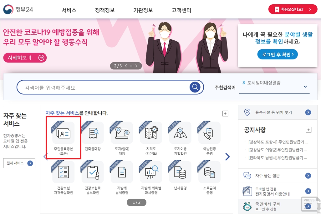 1. 정부24 사이트에 접속을 합니다. 정부24에서 주민등록등본 발급이 가능합니다. 자주 찾는 서비스에서 주민등록등본(초본)을 클릭합니다.