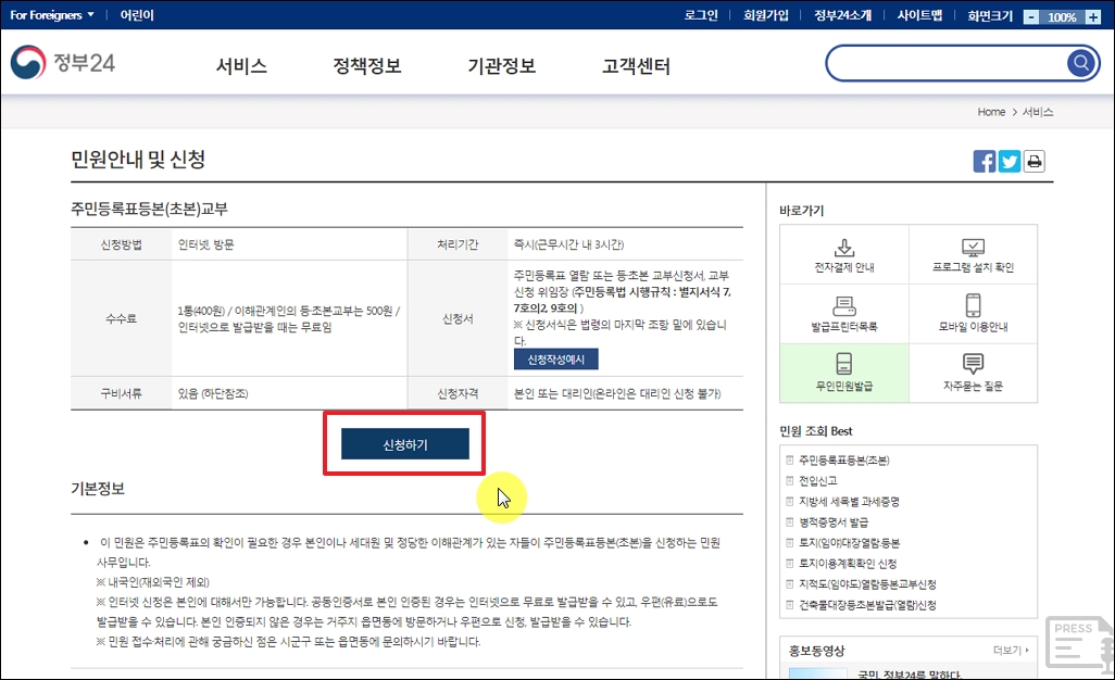 2. 민원안내 및 신청에서 '신청하기' 버튼을 클릭합니다.