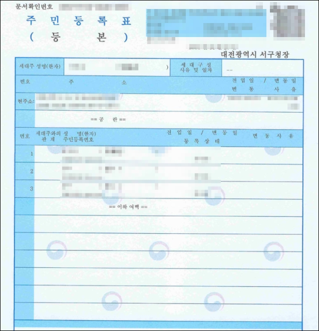 주민등록등본은 세대원의 정보가 포함되어 있으며, 주민등록초본에는 개인의 정보가 담겨 있습니다. 그래서 세대원의 정보 전체가 필요하지 않은 경우라면 주민등록초본을 발급 받으면 됩니다.
