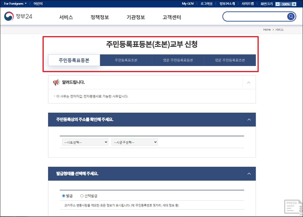 3. 주민등록표등본, 주민등록표초본, 영문 주민등록표등본, 영문 주민등록표초본을 선택합니다.