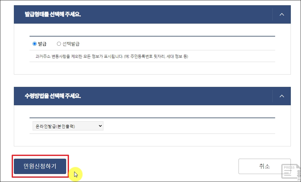 4. 발급형태, 수령방법 등을 선택한 후 민원신청하기를 클릭합니다.