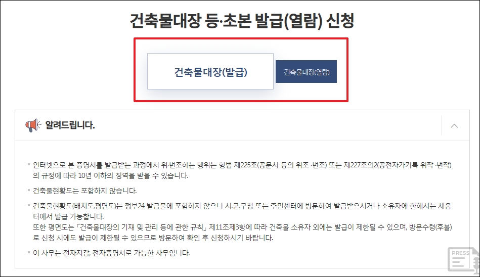 3. 건축물대방(발급) 또는 건축물대장(열람)을 선택하세요.