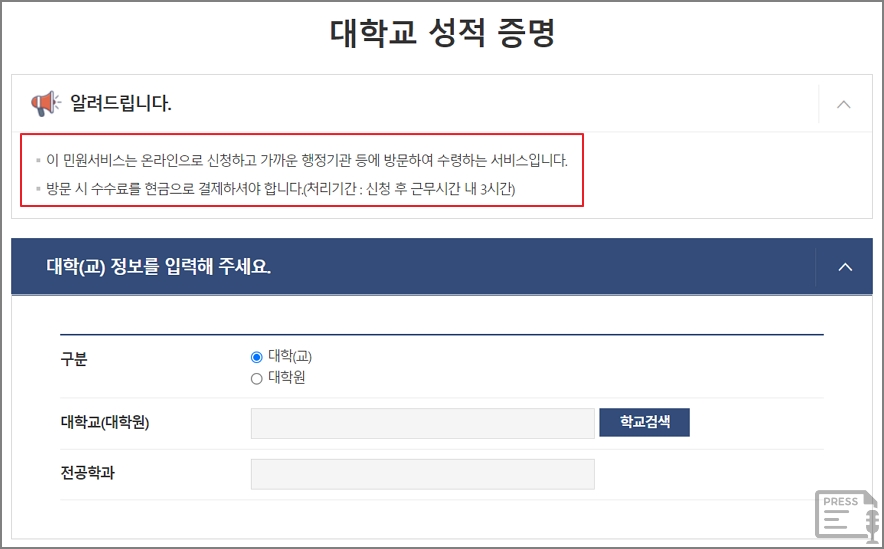 정부24 대학교 성적증명 서비스는 온라인으로 신청을 하고 주민센터 등 가까운 행정기관에 방문을 하여 수령하는 서비스입니다. 바로 출력은 안됩니다. 보통 신청 후 근무시간 내 3시간 이내 완료가 됩니다.