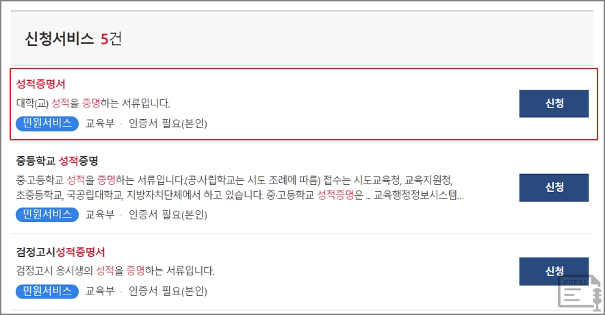 성적증명서 신청을 클릭합니다. 성적증명서는 대학교 성적을 증명하는 서류입니다. 인증서 있어야 하므로 준비를 합니다. 참고로, 정부24에서는 중등학교 성적증명, 검정고시 성적증명서 등도 발급이 가능합니다.