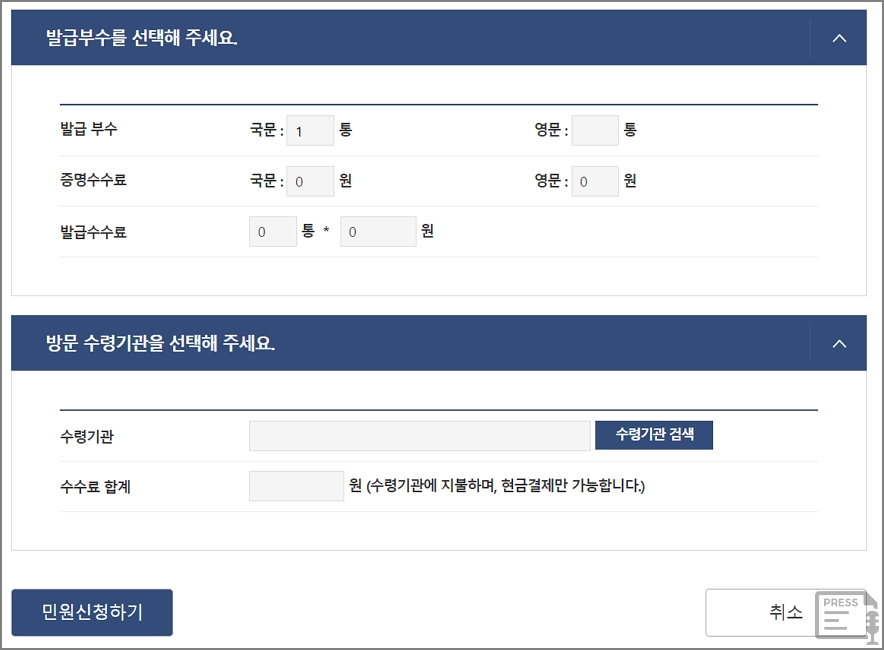 발급부수를 선택하세요. 국문 대학교 성적증명서, 영문 대학교 성적증명서 발급이 가능합니다. 수수료는 1통당 1000원입니다. 행정기관에 방문하여 현금으로 결제를 하여야 합니다. 카드 결제는 안됩니다.