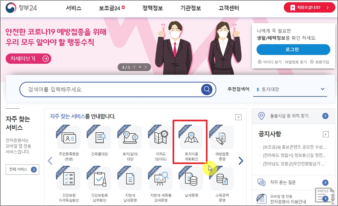 토지이용계획확인서 발급은 정부24에서 가능합니다. 자주 찾는 서비스에 있을 정도로 많이 발급 받는 서류입니다. 방문, 전화, 인터넷으로 어디서나 신청이 가능합니다. www.gov.kr