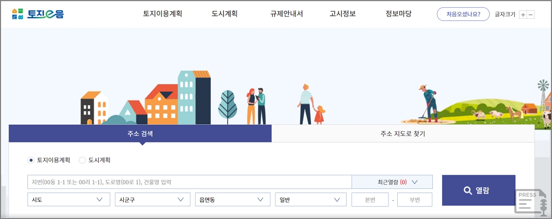 시도, 시군구, 읍면동, 주소를 입력 후 열람을 클릭하면 무료로 토지이용계획을 확인할 수 있습니다.