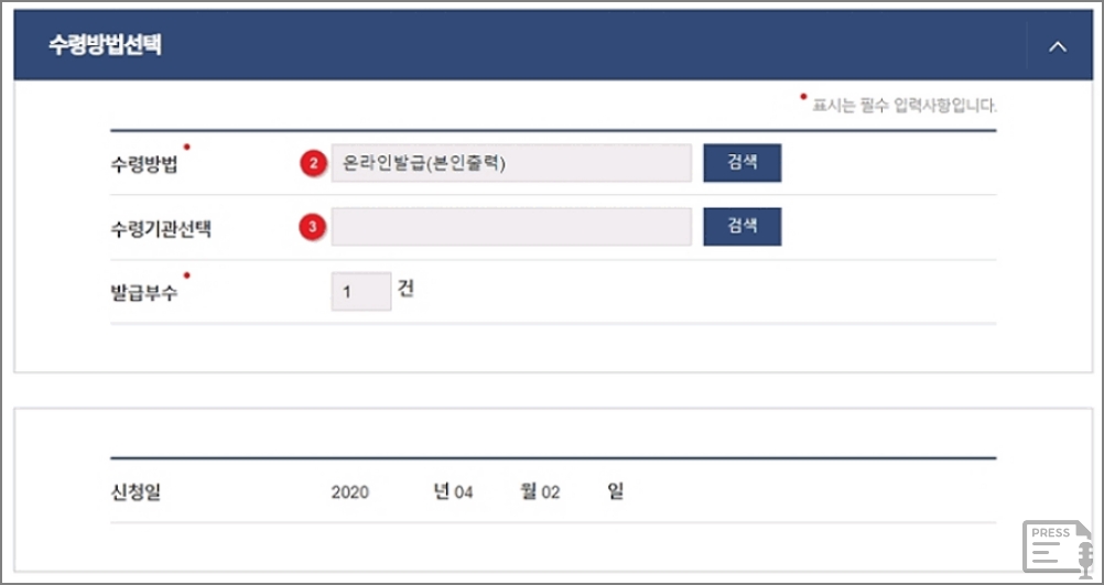 수령방법을 선택합니다. 온라인 발급을 선택하면 바로 출력이 가능합니다.