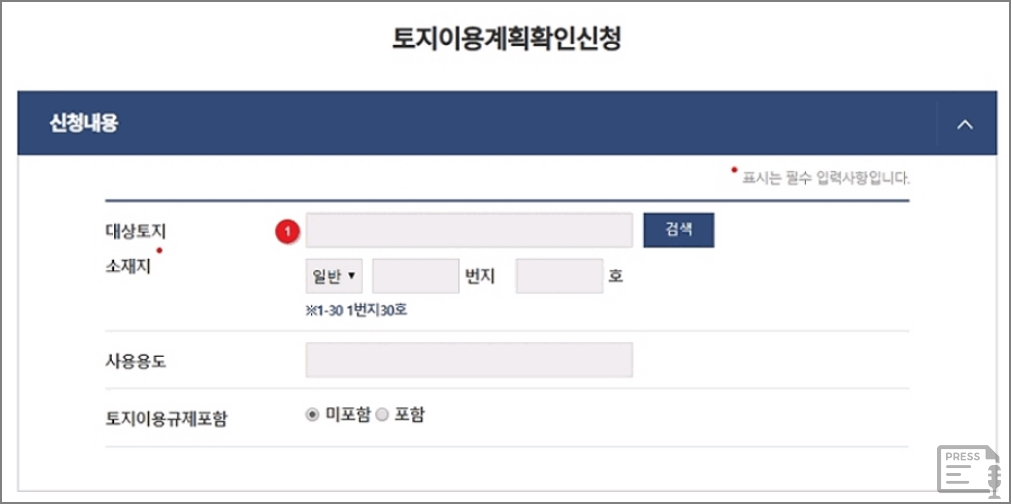 확인이 필요한 대상토지를 검색을 합니다. 사용용도를 입력하고 토지이용규제포함 여부를 선택을 합니다.
