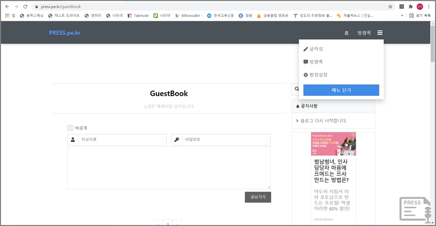 방명록 메뉴를 삭제해봅니다.