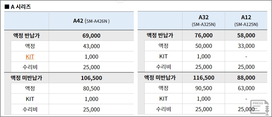 갤럭시 A32의 경우 액정을 반납하는 경우에는 76,000원, 액정을 반납하지 않는 경우에는 116,500원입니다. A12는 액정반납 시에는 58,000원, 액정 미 반납시에는 88,000원입니다.