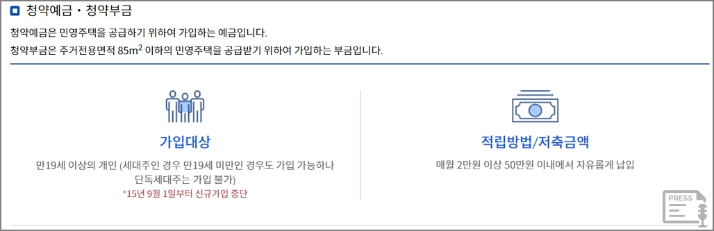 청약예금을 민영주택을 분양 받기 위해 가입하는 예금입니다. 청약부금은 전용면적 85㎡ 이하의 민영주택을 분양 받기 위해 가입하는 부금입니다. 모두 현재는 신규가입이 불가합니다.